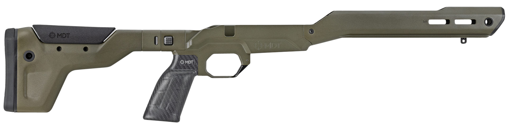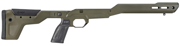 Mdt chassis systems were designed for sports and tactical shooting.However over the years we found that our rifle chassis were often used in hunting, especially our lighter chassis such as our lss chassis system.But we had never purpose-built a chassis system solely for hunting, until now..The mdt hnt26 chassis system is our first truly purpose built hunting rifle chassis.This rifle stock provides you with all of the usual benefits that you expect from a chassis system such as v-block bedding, lop and comb adjustment, aics magazine compatibility etc, but weighs in starting at a mere 26oz.The mdt hnt26 chassis is constructed of a magnesium alloy rifle stock/base, with a carbon fiber forend, a carbon fiber pistol grip and a foam filled carbon fiber buttstock.This model has the arca forend.