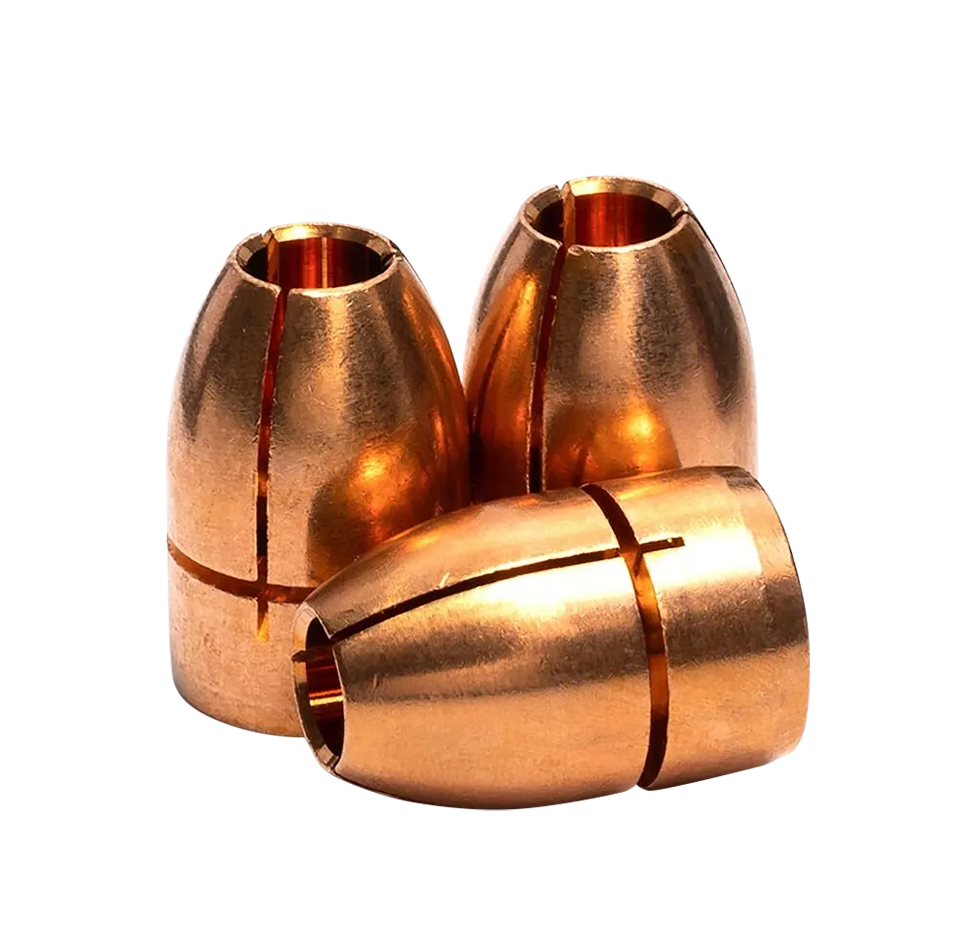 Lehigh controlled fracturing lead free bullets are designed to deliver maximum terminal performance.Controlled fracturing bullets are pre-stressed at specific points so that after a predetermined penetration depth, the razor-edge petals deploy, releasing an energy spike and then separate and radiate outward from the primary path of the bullet.The bullet shank, now back to bore diameter, continues penetrating straight and deep along the initial impact path.Unlike traditional expanding bullets which mushroom and dramatically limit the bullet's penetration and provide only one wound path.