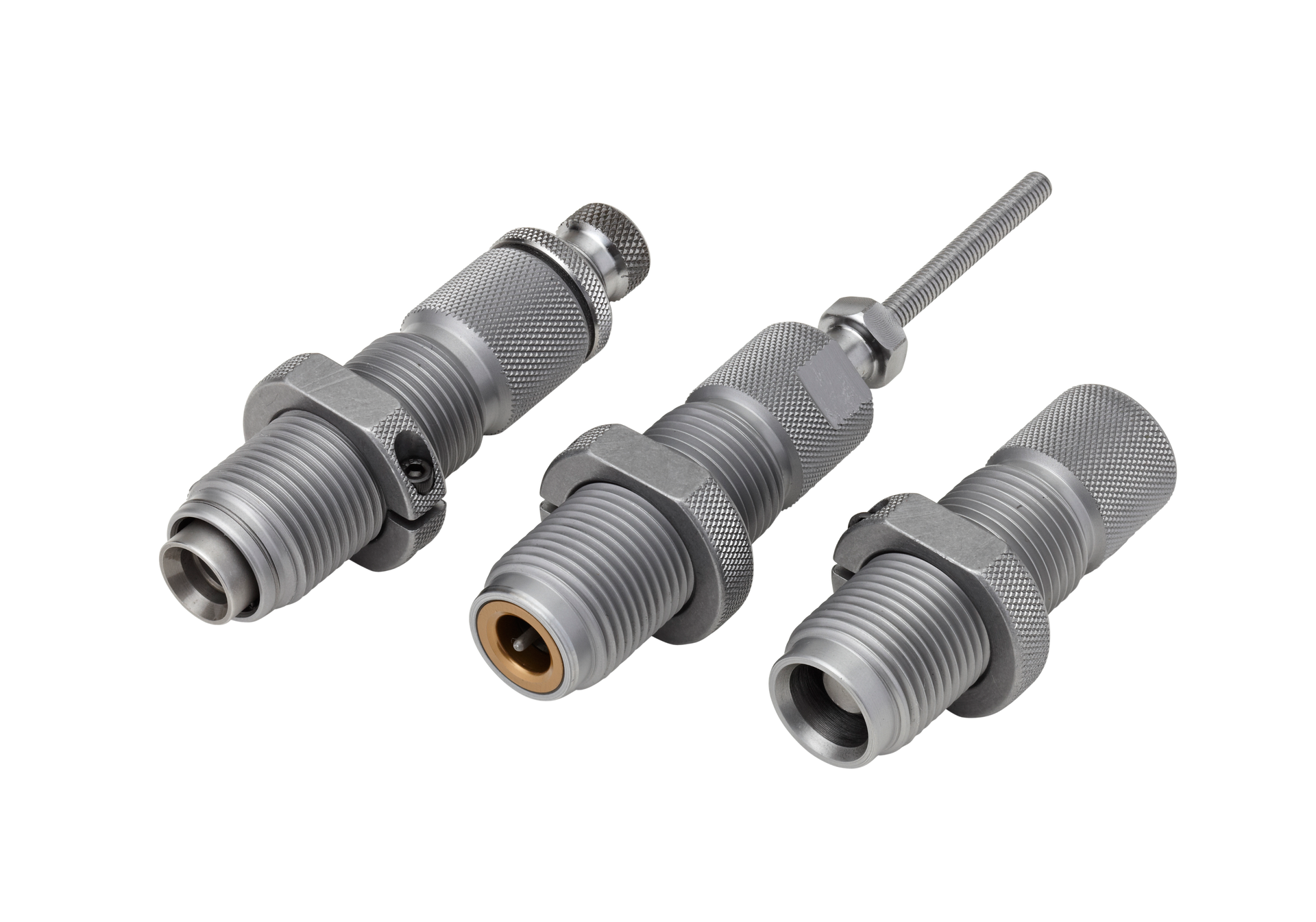 Hornady's custom-grade dies provide a lifetime of reloading.They're so well crafted that they're guaranteed never to break or wear out from normal use and now they're better than ever.The spindle design features a series of light threads out on the spindle and spindle colet.This design eliminates spindle slippage and takes the knuckle busting out of tightening the spindle lock while making spindle adjustments a snap.The series ii die sets are for the most popular handgun cartridges.This three-die set includes: sizer die, expander die, and seating die.