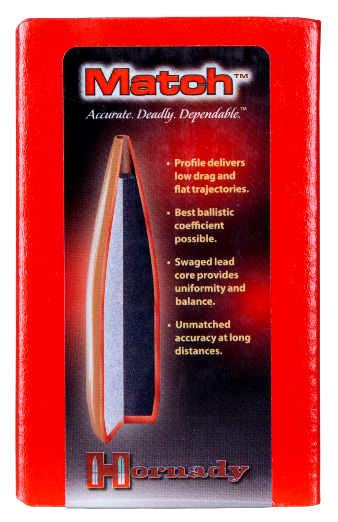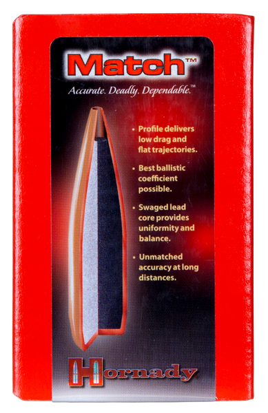 Hornady's match bullets features the revolutionary amp (advanced manufacturing process) bullet jacket.The bullet jackets are a technological advancement in design, tooling, and manufacturing that combine to produce the most consistently concentric bullet jackets available.Coupled with precision swaged cores and manufactured to the tightest standards in the industry, hornady match provides consistency, high ballistic coefficients and unprecedented levels of accuracy.Its geometric profile works to produce low drag and flatter trajectories, while the secant ogive design also provides optimum bearing surface for stability in flight and the best ballistic coefficient possible.The angle and length of the boat tail is unique and optimized for each caliber and weight of match bullet to maximize ballistic coefficient and performance.