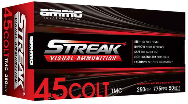 Streaks allows the shooter to visually see the projectiles path toward its target.Streak rounds are nonincendiary.They do not generate heat so they are safe to use in environments where tracers are prohibited and can become a serious fire hazard.The results are game-changing in many aspects for the consumer, law enforcement, and military.For indoor range use and low light shooting.Caliber: 45 ColtBullet Type: Total Metal CaseBullet...View more