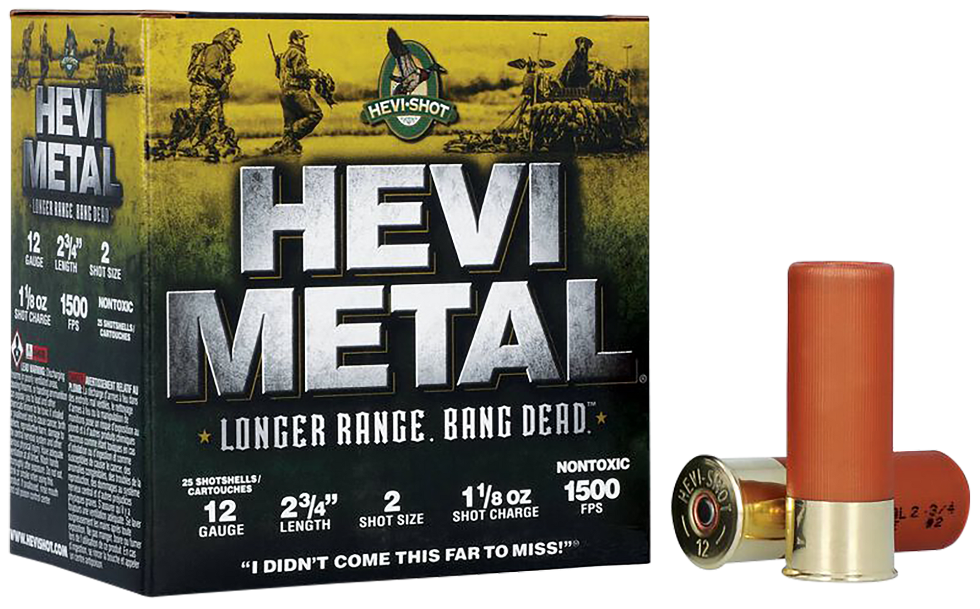 Driven by pattern density technology, hevi-metal longer range is all about more pellets on target at longer range.It features a 30% layer of bismuth which is one shot size smaller than the 70% steel.This ensures both layers have equal downrange performance.Application: HuntingGauge: 12 GaugeLength: 2.75"Ounces: 1 1/8 ozShot Size: 2Muzzle Velocity: 1500 fpsRounds Per Box: 25Boxes Per Case: 10Hazair: YesView more