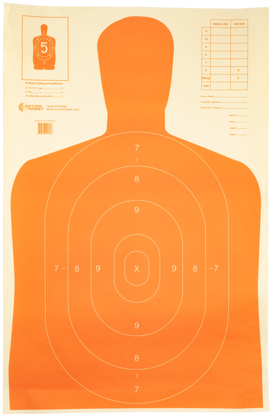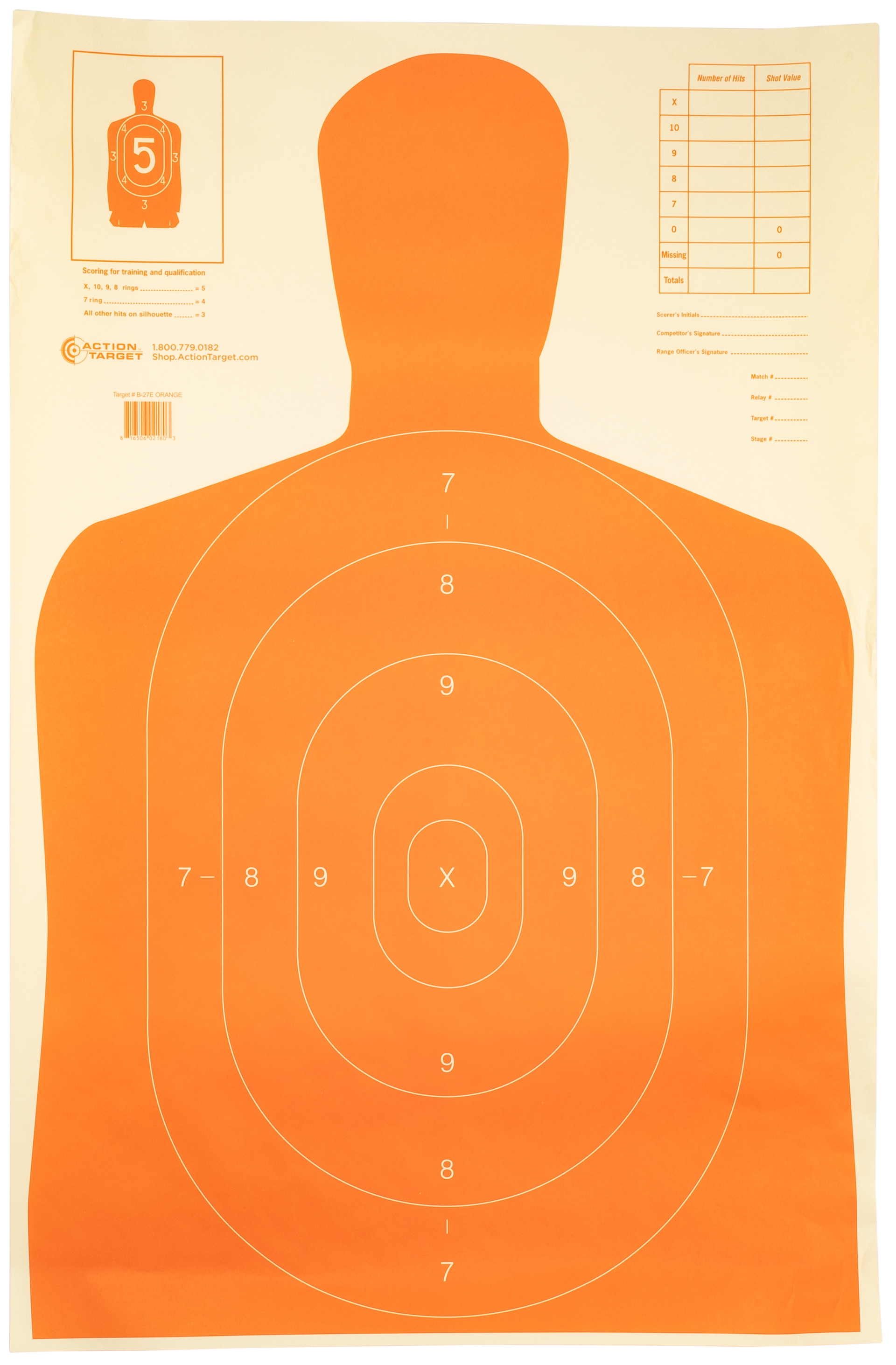This b-27 paper target features a full size b-27 orange silhouette with a cut off ring below 7.It has dimensions of 23" x 35".