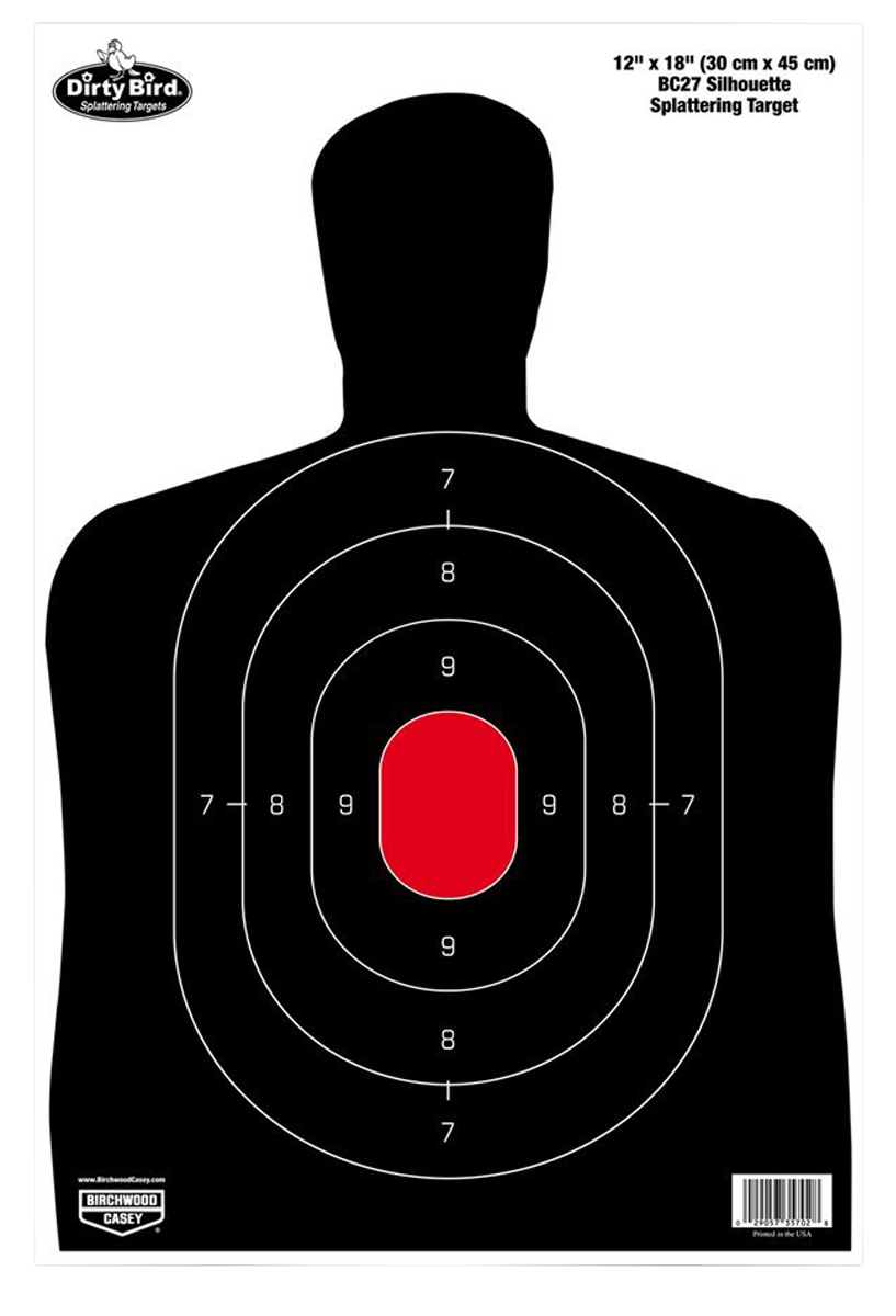 Birchwood casey's dirty bird bc-27 silhouette target allows you to spot your shots easily with white splatter for superior downrange contrast.The heavy tagboard construction is great for indoor or outdoor use, and all types of pistol-action shooting.The non-adhesive back also allows you to affix to a surface as you wish, add notes, and then easily save the targets for future reference.