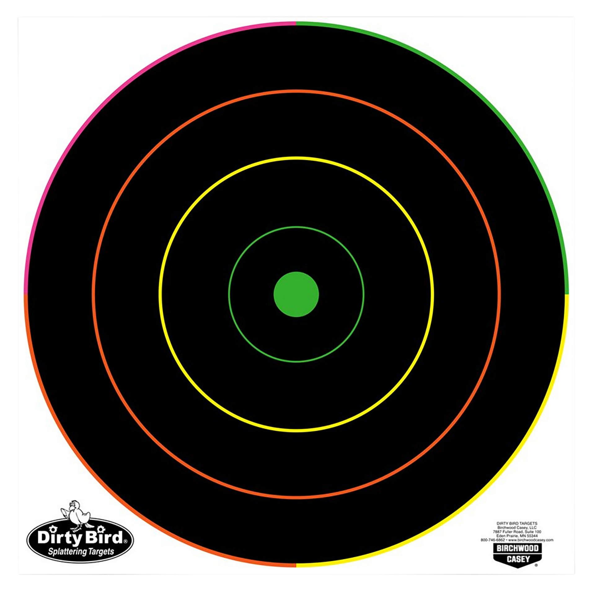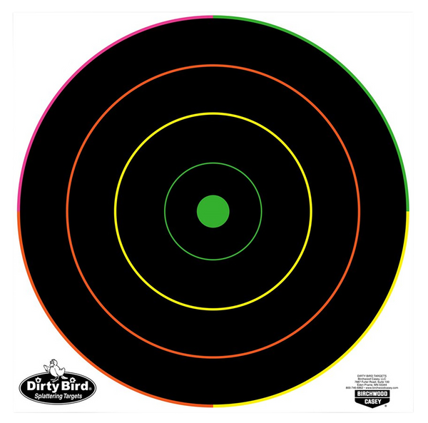 Birchwood's dirty bird multi-color splattering target features the idea the same as the standard dirty bird targets' the name comes from the splatter of color that appears upon bullet impact, which makes the hole highly visible even at a distance.The concentric circles of the bulls-eye each have its own color splatter, so you can tell by the color how close you are to the center.Heavy...View more