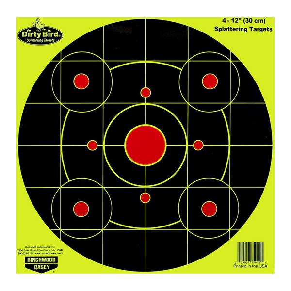 This target offers a yellow reaction to the classic dirty bird splattering performance.Designed to be the best of both worlds; a classic bull's-eye with a functioning sight-in pattern.Enhancement Color: YellowSize: 12"Quantity: 4 PackMaterial: PaperIllustration: CircleMount Type: HangingTarget Color: Black/RedView more