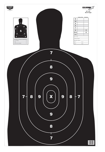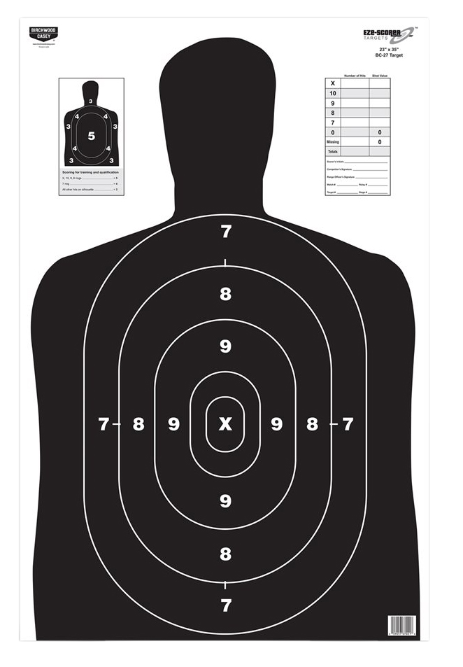 This birchwood casey eze-scorer bc-27 target is ideal for indoor and outdoor ranges.It features a high-contrast black silhouette, scoring table, and a score card printed on the target.