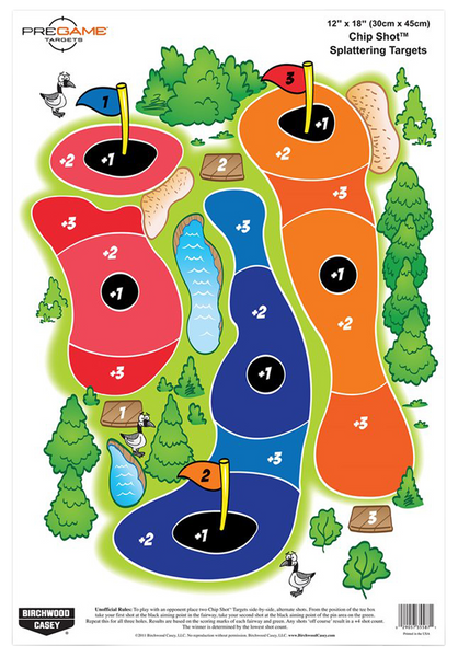 Fun for all ages.Improve your shooting skills with these colorful dirty bird style targets.Use them while shooting alone or appeal to your competitive side and shoot with a partner.Be creative, there are no official rules of play, create your own and have fun.Enhancement Color: WhiteType: SplatterSize: 12" x 18"Quantity: 8 PackMaterial: PaperIllustration: Chip ShotAmmo Type: AllAuto Resetting: NoImpact Enhancement: YesMount Type: Self-AdhesiveTarget Color: Multi-ColorView more