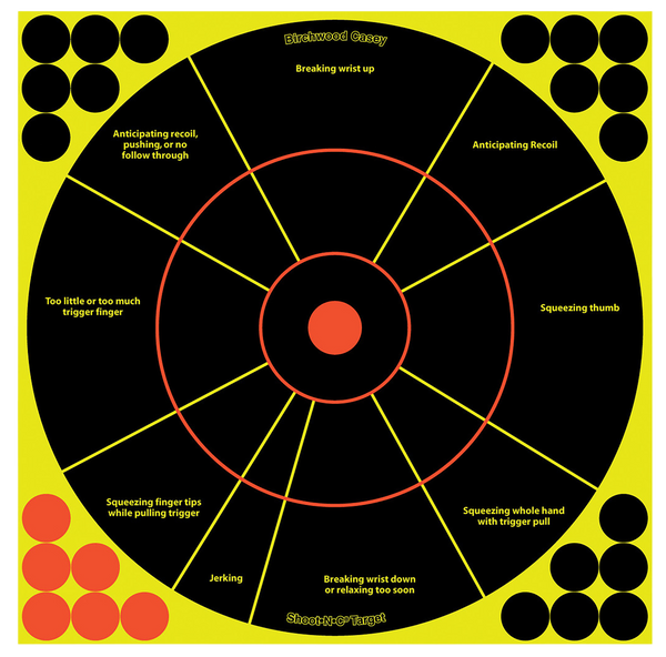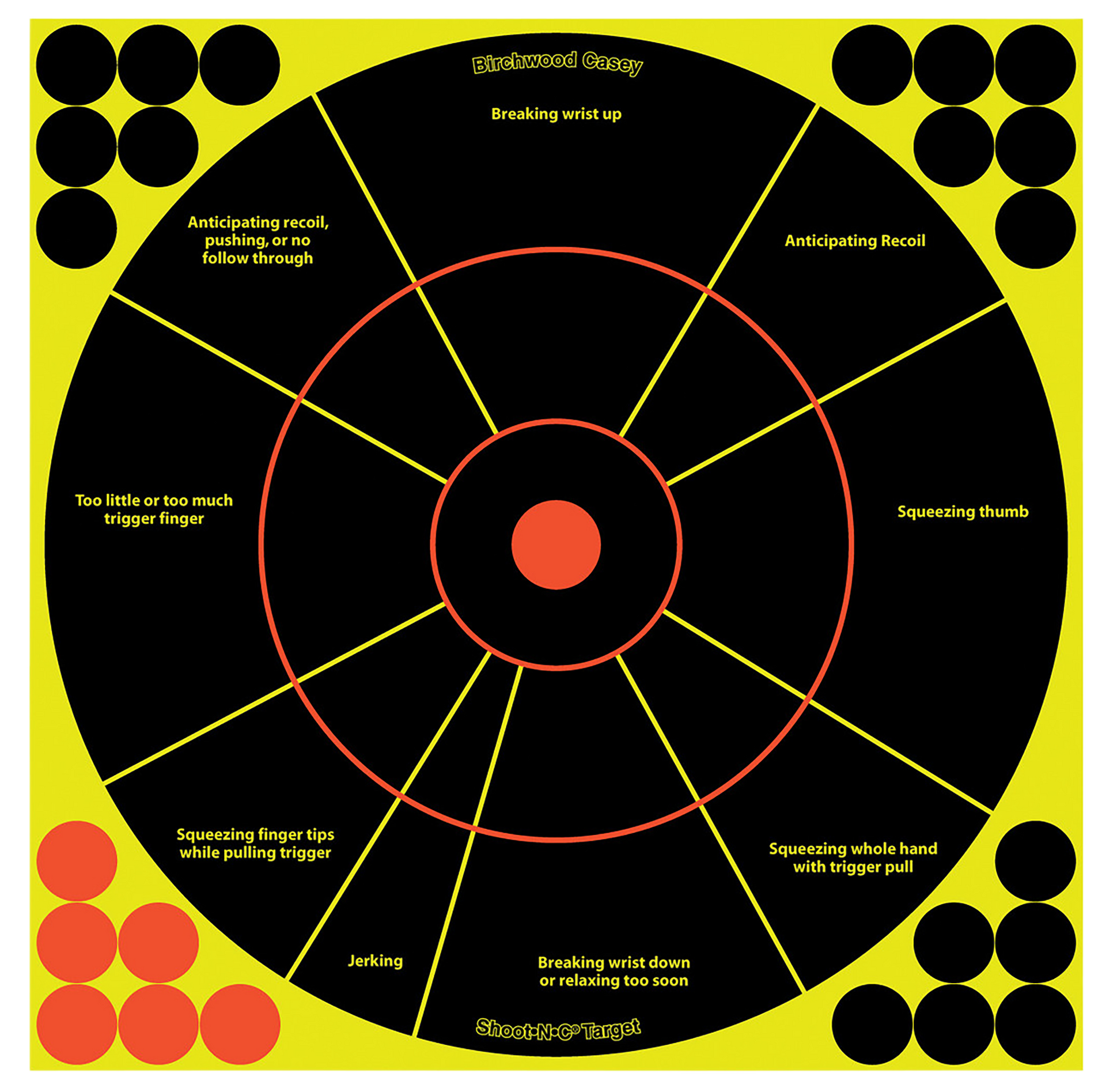 The shoot-n-c technology, combined with distinct instructional zones, not only make shot placement highly visible revealing bullet holes with bright chartreuse rings, but can improve handgun marksmanship helpful corrections to tighten groups and build confidence.Includes 110 repair pasters.