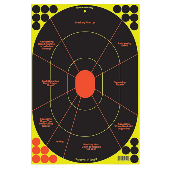 Shoot-n-c targets have long been the standard for reactive targets.Crisp, chartreuse rings around each bullet hole eliminate the need to walk down range to check results.Includes 110 repair pasters to lengthen target life.