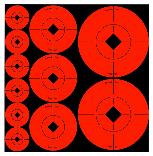 Birchwood self-adhesive, convenient orange target spots in different sizes create instant bull's-eyes for all types of target practices.The radiant orange color allows shooters to see a sharper sight picture and bullet holes more clearly for better scores and smaller groups.One package with three size target spots- 60- 1" targets, 30- 2" targets and 20- 3" target spots.Enhancement Color: NoneType: TargetSize: 1"/2"/3"Quantity: 60 PackMaterial: PaperIllustration: BullseyeAmmo...View more