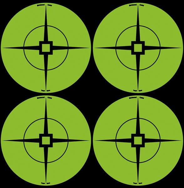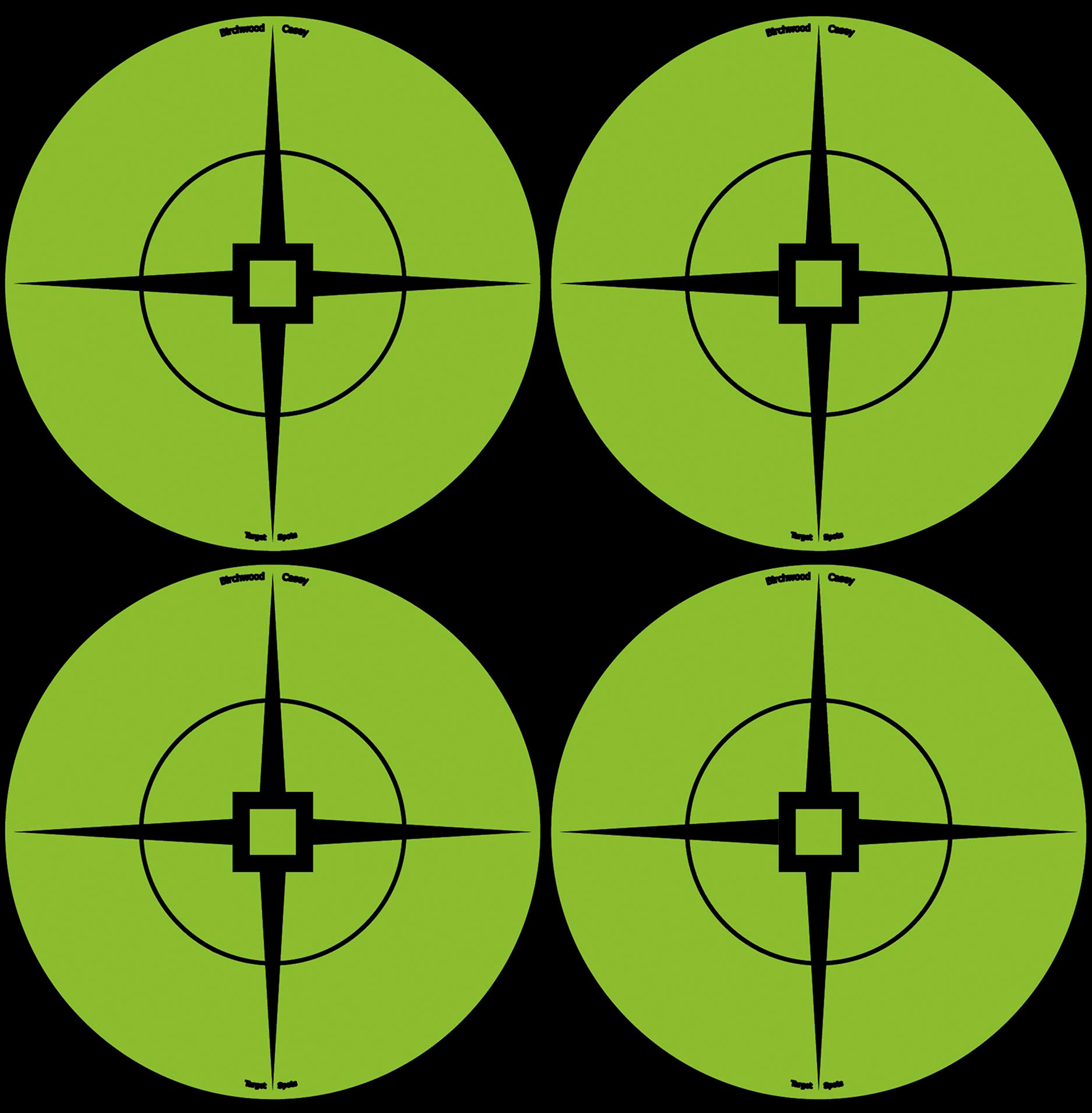 Birchwood 3" self adhesive target spots come in highly visible atomic green.The crosshair design fulfills the needs of open sight shooters along with scope users.Easily line up open sights on the center square or lay the crosshairs along the vertical and horizontal diminishing lines.As an additional option, turn the target spots slightly to position the crosshairs in an x pattern.Includes pasters to extend target life.