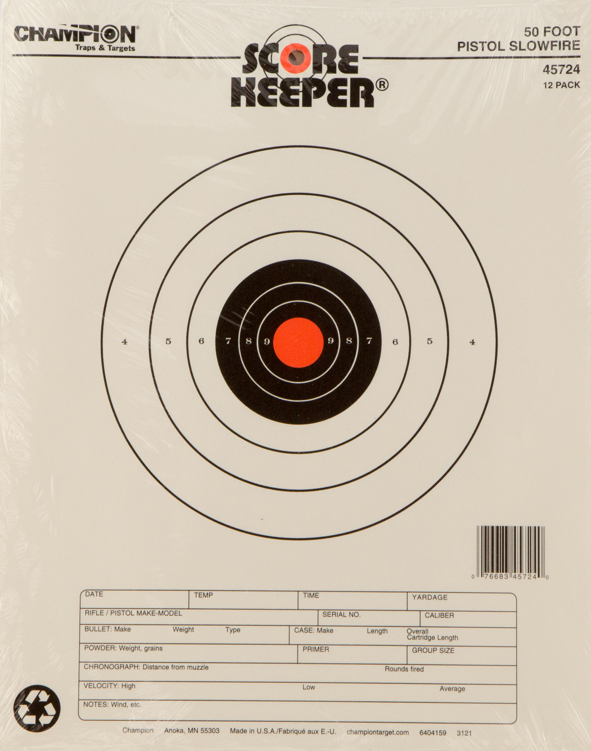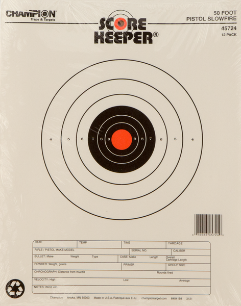 For the serious plinker and competition shooter, champion's score keeper targets offer brightly colored designs with a notes section for scoring your success.Target is patterned for 50 ft pistol slowfire.It comes in a 12 pack of 11" x 16" targets.