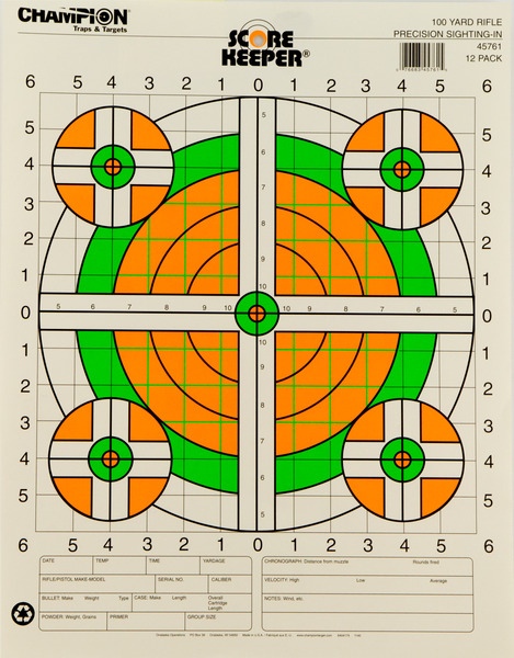 This scorekeeper features a "built-in" record-keeping section that lets you track vital data to refine your loads and zero-in on tight groups.Target is for sighting in your rifle in at 100 yds.