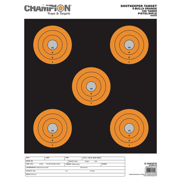 Champion's shotkeeper series provides a broad assortment of color contrasts to ensure good shooting visibility in all light conditions and terrain.Five bullseyes per target increases product life.Notes section for recording details for later review.
