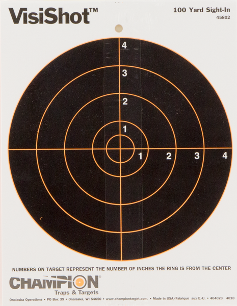 Visishot target technology makes spotting scopes and trips down the range to check shot placement a thing of the past.Bright orange circles appear from shots on a black background.Designed for 100 yard sighting-in, this 8.5" x 11" target features one 8" bullseye per page, 10 pack.
