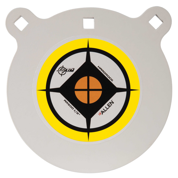 The ez-aim hardrock ar500 target is made of 1/2" thick armor plate steel to withstand the impact from high power hunting rifles.The white powder coat finish shows bullet impacts.Ez-aim hardrock gongs have three connection points: two at the edge for attaching chains or straps and one in the center for gong hook attachment: dimensions 8" diameter and 1/2" thickness.