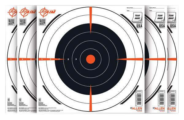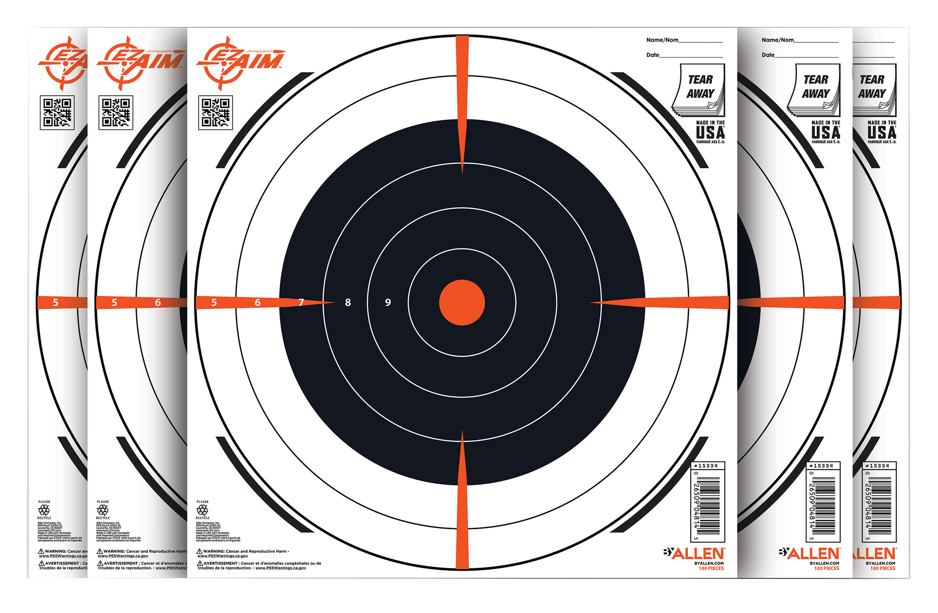 The ez aim bullseye is a great all purpose target.The bound design keeps targets looking great..It has concentric rings in a one-inch increments.The bright orange one-inch aiming point is easy to see.Scope aligner hash marks.The target is 12 x 12 inches.Two color print, bright orange color and black print.100 targets per pack