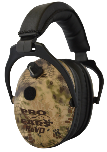 Pro ears revo electronic earmuffs are ideal for smaller heads and ears.The nrr 25 electronic muffs are designed with ear pads that are specially shaped to eliminate gaps in the seal around the ear near the jaw line on smaller heads.Type: ElectronicColor: Kryptek Highlander/BlackNrr: 25 dBQuantity: 1 PairStyle: Over the HeadBattery Size: NMaterial: PolymerView more