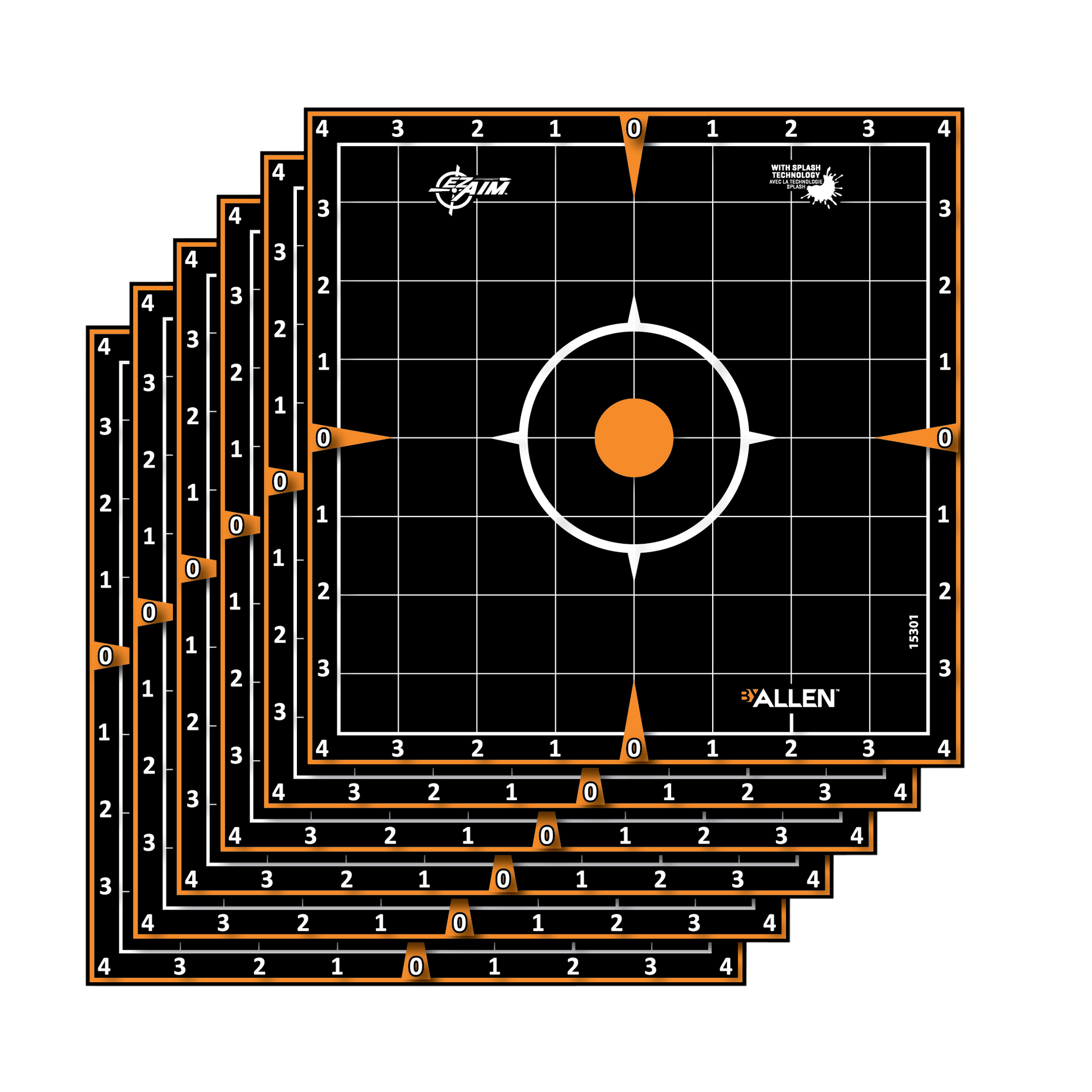 The ez aim adhesive splash reactive paper sight-in grid targets are designed to help improve accuracy and confidence for when needed.Enhancement Color: Bright YellowQuantity: 6 PackMaterial: PaperIllustration: Sight-In GridMount Type: Self-AdhesiveTarget Color: Black/OrangeView more