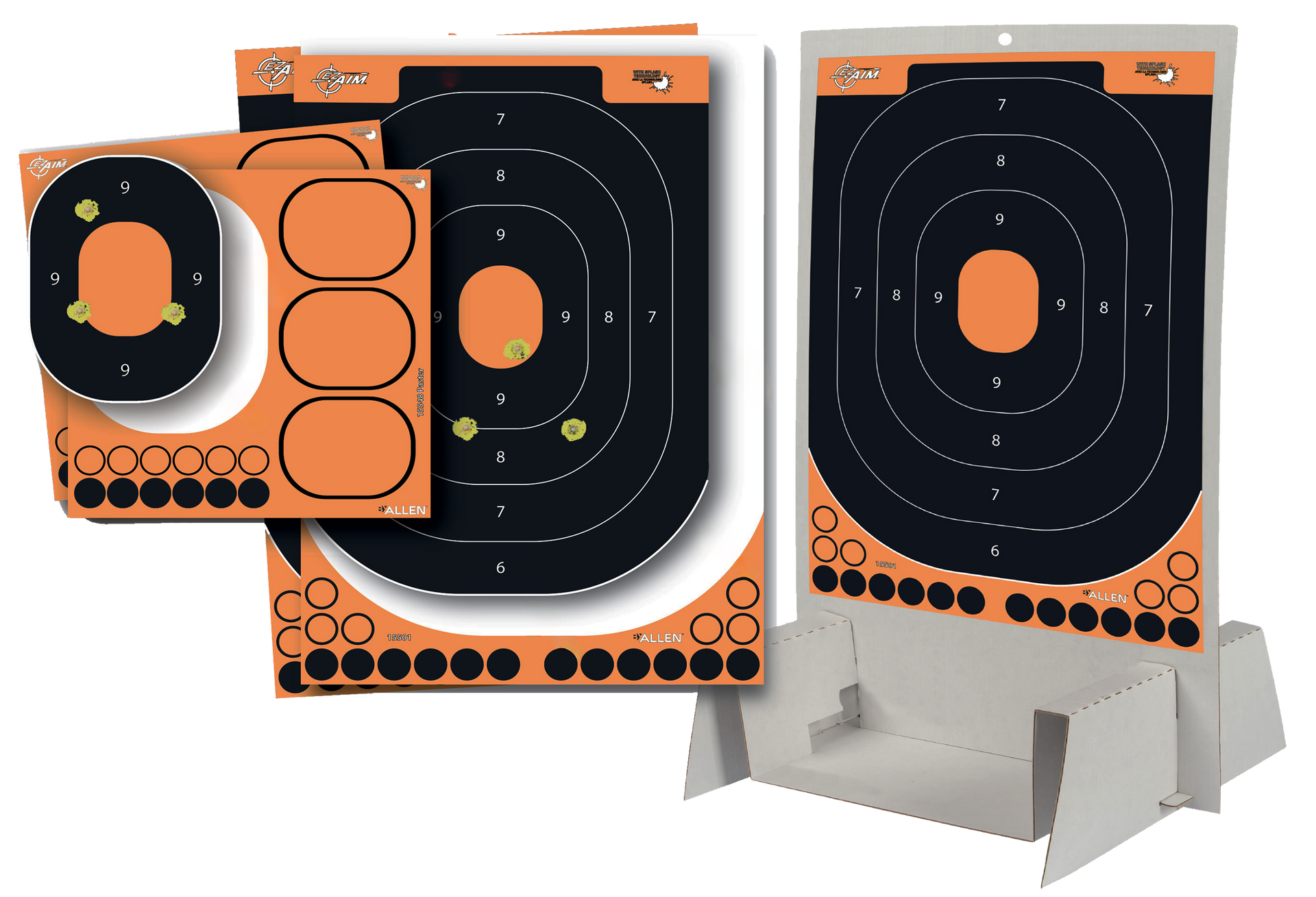 The ez aim splash adhesive handgun trainer kit is designed to be the complete solution as an instant target.The adhesive splash targets attach to the corrugated backer.The targets show the shooter the impact of the bullet by creating a bright chartreuse halo around the bullet hole.The target has an adhesive back so it can be quickly applied to the backstop.The backstop is 22" tall and 14" wide.The base is designed to be weighted in use by sand or a rock.Includes 2 each 12 x 18 handgun trainer targets, 2 each replacement center of mass pasters, 6 each 10-ring replacement pasters, 60 bullet hole covers.