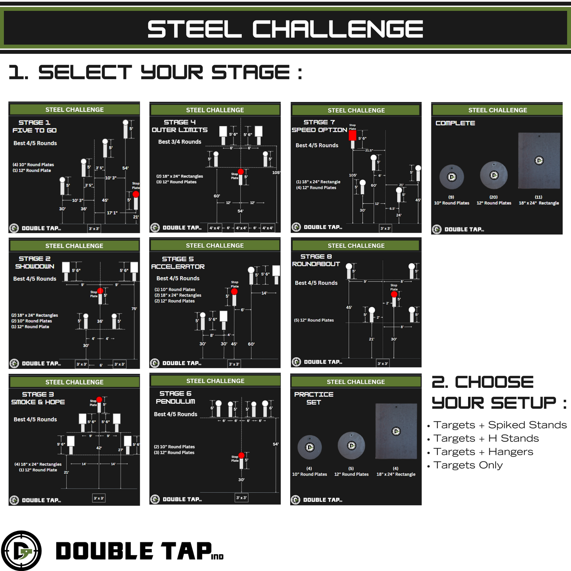 Looking for a complete Steel Challenge setup but worried about breaking the bank? This Steel Challenge package by Double Tap Industries has you covered. It includes all targets, stands, and hardware needed for the stage you choose, designed with an emphasis on ease and precision.