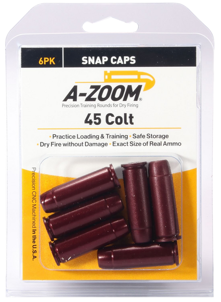A-zoom revolver snap caps are for safe cowboy sixgun, quick draw practice and lever action dry firing practice drills.Cnc-machined from solid aluminum to precise cartridge dimensions, then hard-anodized for smooth functioning and long life.Each round has a-zoom's durable "dead cap" proven to withstand over 3,000 dry fires while protecting the firing pin.Type: Snap CapsCaliber Or Gauge: 45 Colt (LC)Rounds Per Box: 6Material: AluminumView more