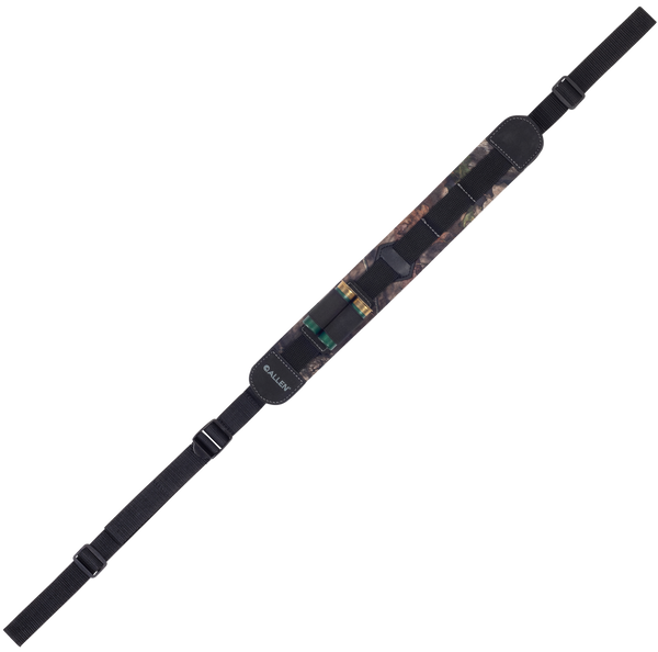 The yukon neoprene sling with shotgun shell loops features a neoprene pad with a non-slip back with four elastic shell holding loops.This sling also has a thumb ring loop and heavy duty web construction with a mossy oak break-up country camo finish.