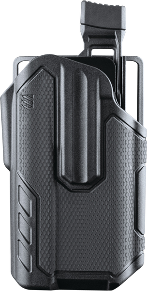 The blackhawk's omnivore multi-fit holster accommodates more than 150 styles of semi-automatic handguns.The active retention mechanism locks onto a proprietary rail attachment device, not the frame of the handgun for the non-light bearing model.Its instinctive thumb release disengages the locking mechanism from the rail attachment device when drawing the handgun.Fits most semi-autos with surefire x300/x300u-a lights.