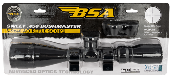 The bsa sweet 450 bushmaster ao rifle scope is specifically designed for the 450 bushmaster cartridge.Complete with three ballistically calibrated turrets for 245gr, 250gr and 260gr cartridges.The sweet 450 bushmaster ao features an adjustable objective, fully coated lenses, 30/30 reticle, aluminum construction and matte black finish.Includes 2 pc.Weaver rings.