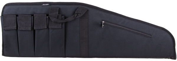 Bulldog's extreme tactical rifle case is constructed of durable, heavy-duty nylon, water-resistant outer shell, heavy-duty double stitching and a #10 heavy-duty, full-length zipper with pull.It has a zippered accessory pocket, and a laminated tricot, heat-resistant inner lining and a total of 2.25" soft padding.The extreme tactical case has four velcro-close external magazine pouches and a removable, adjustable shoulder strap with swivels.
