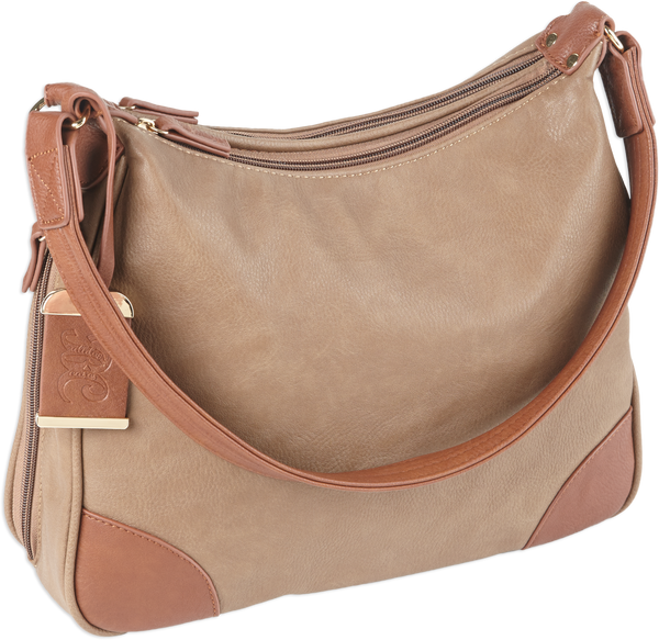Designed for left or right handed use, the hobo style purse is made of attractive durable leather.It has a color matched holster made to fit most small autos and revolvers.The two separate zippered main compartments are fully lined and there is an external zippered accessory pocket.The slash-resistant shoulder strap will reinforce the ability for the purse to remain in possession if a theft were attempted.The purse's exterior dimensions are 13" x 10.5" x 3.5".