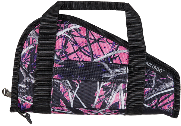Bulldog's pistol rug with pocket and handles is constructed of a water-resistant, extra heavy-duty nylon with a full length zipper, a velcro accessory pocket, and 1.75" soft padding.This 12" x 6" pistol rug has a muddy gril camo finish with black trim and holds one handgun.