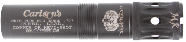 Carlson's cremator choke tubes feature our new triple shot technology and is offered in close mid and long range constrictions.Tst is a series of three graduated rings in the taper section of the choke tube, that allow a more gradual transition from the shotgun bore to the final constriction.The cremator offers reduced pellet deformation, less flyers, more dense patterns, wrench-less installation, quick removal and muzzle protection.Made in the usa.*note- optima hp and remington pro bore long range cannot be used with any steel shot larger than #2.