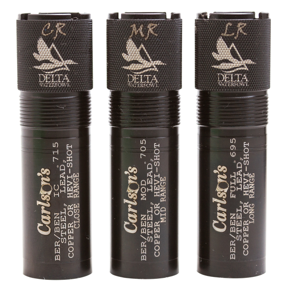 Carlson's waterfowl choke tubes are manufactured from 1704 stainless steel and designed to throw tighter and denser patterns than conventional choke tubes.These choke tubes feature a 25% longer parallel section in the choke, thus throwing more consistent patterns.Each choke tube is knurled on the end to allow for quick and easy removal.Each choke tube has the constriction and size laser marked on the end and body for easy reference.Steel shot may be used through these choke tubes with exceptional results.*note- do not shoot steel shot larger than bb or any steel load faster than 1550 fps through the full or extra full constrictions.Slugs, sabots, and rifled slugs are not to be used in any choke constriction tighter than improved cylinder.Remember to pattern your shotgun choke tube with the specific shotshell load you are going to be using.Different brands of ammunition throw different patterns from the same choke tube.