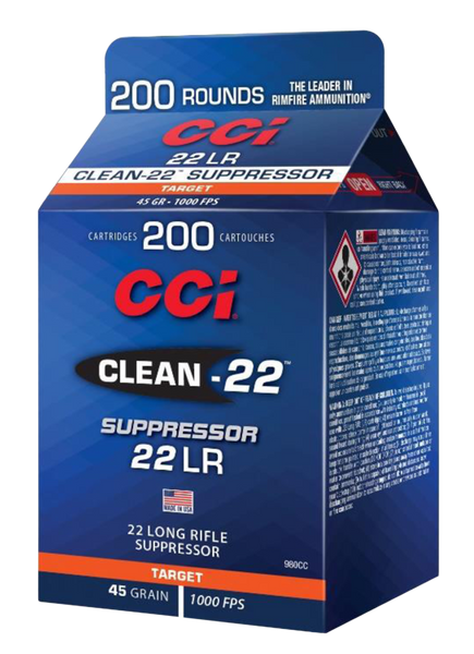 Cci's clean-22 suppressor uses an advanced polymer bullet coating to reduce lead fouling inside a suppressor by 60 percent.The exclusive feature allows much easier suppressor cleaning and maintenance, as well as excellent accuracy.Bullet Coating: PolymerCaliber: 22 LRBullet Type: Lead Round NoseBullet Weight: 45 grMuzzle Energy: 100 ft lbsMuzzle Velocity: 1000 fpsCasing Material: BrassRounds Per Box: 200Boxes Per Case: 10Hazair: YesView more