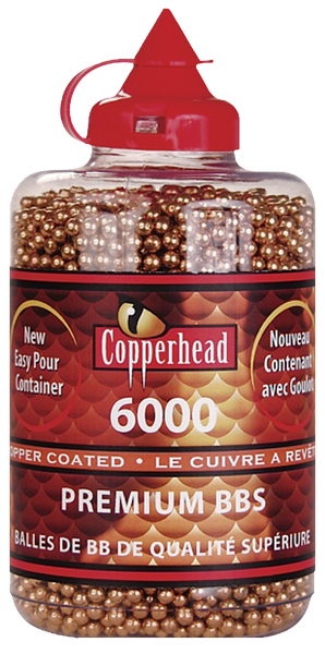 Crosman has the only copper-coated steel bbs.These copperhead bbs are sold in user-friendly, resealable plastic packaging with an easy-pour spout.Type: BBCaliber: 177Style: BBMaterial: Copper-Coated SteelQuantity: 6000 Per BottleView more