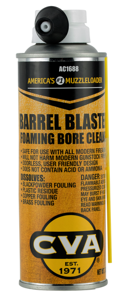 Cva barrel blasting bore cleaner barrel is specifically formulated for black powder firearms.Simply spray the barrel blaster solvent into barrel and allow it to sit for one hour.Then simply swab the foam out of barrel to finish cleaning.