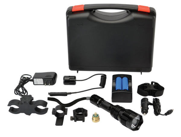 The vb250 varmint light features a 250 lumen high-output cree led light (includes both green and red led modules), up to 4 hours of burn time and a push button on/off tail cap switch.This kit includes a brq scope mount adapter, shotgun mount, rechargeable a/c and car charger, a hard shell carry case and two 3.7v 2400mah batteries.