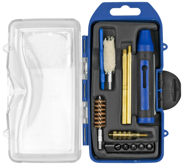 Multi-function handle can be used w/traditional rods, pull cords and also functions as a screwdriver handle, two piece solid brass rod, one phosphor bronze brush, one mop, one solid brass jag, one plastic slot tip, 25 cleaning patches, one set of 6 driver bits, custom molded tray in a clear top dual bond molded tpr locking case
