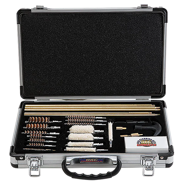<p>the deluxe universal gun cleaning kit by dac technologies contains: two sets of three solid brass rods, one handle, 10 bore brushes (.17cal-.45cal and 410/20/12ga), 6 mops (.17cal,.22cal,.38/.357/9mm, 410, 20 and 12ga), two brass brush adaptors, one handle adaptor, two slot tips for patches, 6 jags, and 50 cleaning patches.</p>
