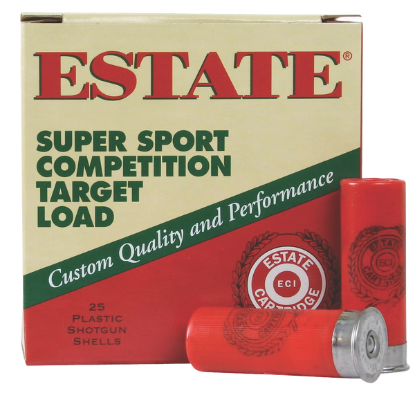 Estate's super sport competition target loads include fine progressive burning powder, specially designed perforated wads, magnum grade multi-screened shot and biaxially-oriented plastic hulls with a brass-plated metal head sensitive to uniform primers.