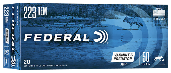 Federal varmint & predator loads use top-quality bullet designs to deliver accuracy and explosive expansion.The extremely reliable brass, primer and propellant ensure the utmost reliability.Caliber: 223 RemBullet Type: Jacketed Hollow PointBullet Weight: 50 grMuzzle Energy: 1227 ft lbsMuzzle Velocity: 3325 fpsRounds Per Box: 20Boxes Per Case: 25Application: HuntingCasing Material: BrassHazair: YesView more