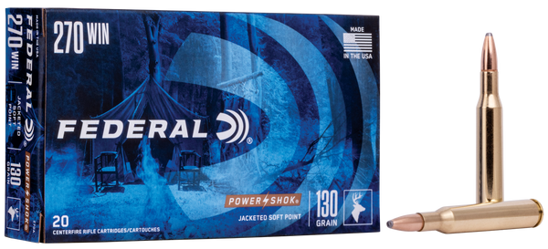 The traditional lead-core hunting bullets in federal power-shok rifle loads provide solid accuracy and power at an affordable price.They feature reliable federal brass, primers and powder and are suited to a wide variety of medium and big game.Caliber: 270 WinBullet Type: Jacketed Soft PointBullet Weight: 130 grMuzzle Energy: 2703 ft lbsMuzzle Velocity: 3060 fpsRounds Per Box: 20Boxes Per Case: 10Application: HuntingCasing Material: BrassHazair: YesView more