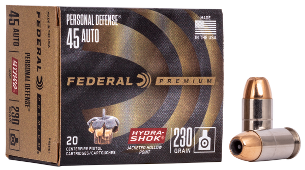 Hydra-shok remains one of the most popular choices among self-defense experts.Federal premium uses stringent manufacturing processes and rigorous testing to ensure hydra-shok loads perform accurately and consistently.Caliber: 45 ACPBullet Type: Hydra-Shok Jacketed Hollow PointBullet Weight: 230 grMuzzle Energy: 414 ft lbsMuzzle Velocity: 900 fpsRounds Per Box: 20Boxes Per Case: 25Application: Home DefenseCasing Material: Nickel-Plated BrassHazair: YesView more