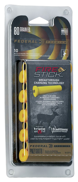 Federal premium firestick is the critical component of a whole new ignition system that uses an encapsulated propellant charge that loads from the breech, with the bullet loaded from the muzzle.The charge is completely impervious to moisture and loaded with clean-burning hodgdon triple eight powder to the same tight tolerances as federal premium factory ammunition.*shooter inserts 209 shotgun primer (not included).