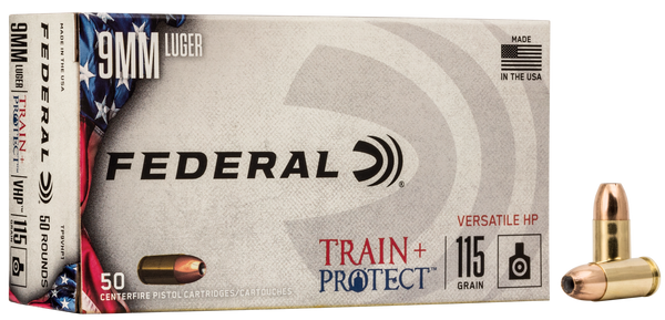 Federal train + protect uses the vhp bullet design to provide both precise, practical, performance at the range, and instant reliable expansion on impact.The result is the ideal combination for training as well as defense.Caliber: 9mm LugerBullet Type: Versatile Hollow PointBullet Weight: 115 grMuzzle Energy: 356 ft lbsMuzzle Velocity: 1180 fpsRounds Per Box: 50Boxes Per Case: 10Application: Home DefenseCasing Material: BrassHazair: YesView more