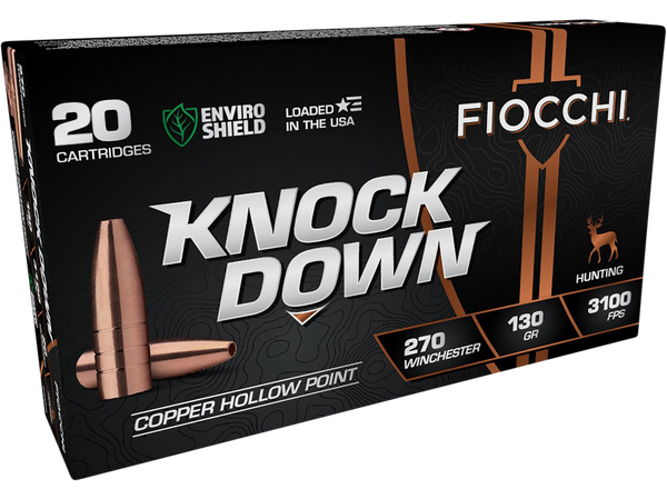 Fiocchi knock down enviro shield 270 win 130 gr hollow point 20 per box/ 10 csCaliber: 270 WinBullet Type: Hollow PointBullet Weight: 130 grMuzzle Velocity: 3100 fpsRounds Per Box: 20Boxes Per Case: 10Casing Material: CopperHazair: YesView more