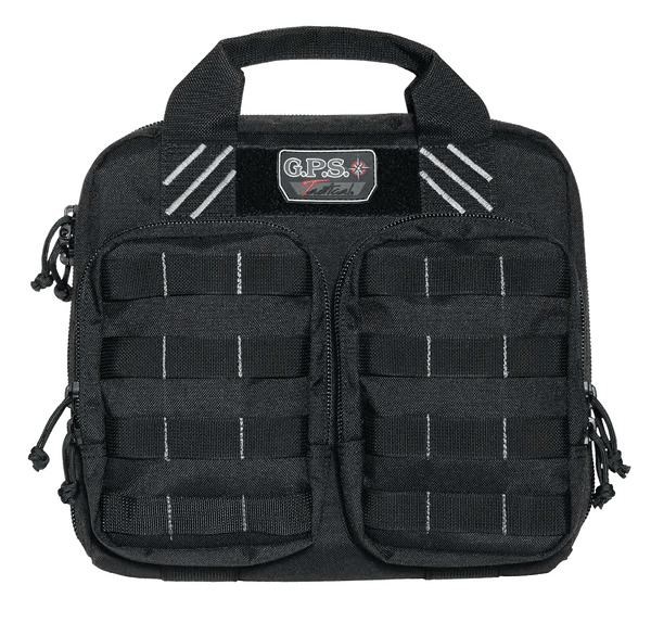 The tactical double +2 pistol case has a double quilted inside storage area measuring 11"h x 12.5"w, for double handgun storage on each side.It also has twin front ammo pockets with triple-stitched molle webbing with a ykk locking zipper on the main compartment for legal transport.Visual id storage areas have pockets for magazines and velour-lining to protect glasses and ear pieces.The tactical double +2 pistol case has a hook and loop gps tactical logo patch, removable to personalize with a name or club placard.The gps tactical line of gear is made of 1000 denier heavy-duty material with dupont teflon coating for grime resistance and is sewn with mildew- and rot-resistant nylon-based thread using box and bar tack reinforced stitching in all critical areas.