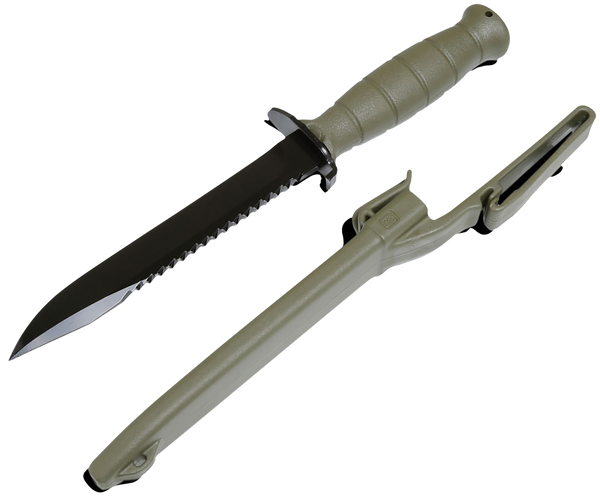 Glock field knife w/saw survival knife is an ideal addition to any tool kit, field pack or belt.It features a tough 7" carbon steel clip point blade and molded polymer hilt, tough enough to break windows or cut through the toughest tree limb, yet perfectly balanced for appropriate conditions.The set includes an integral retention system to keep your glock knife secure during times of extreme activity.Clamshell packaging.